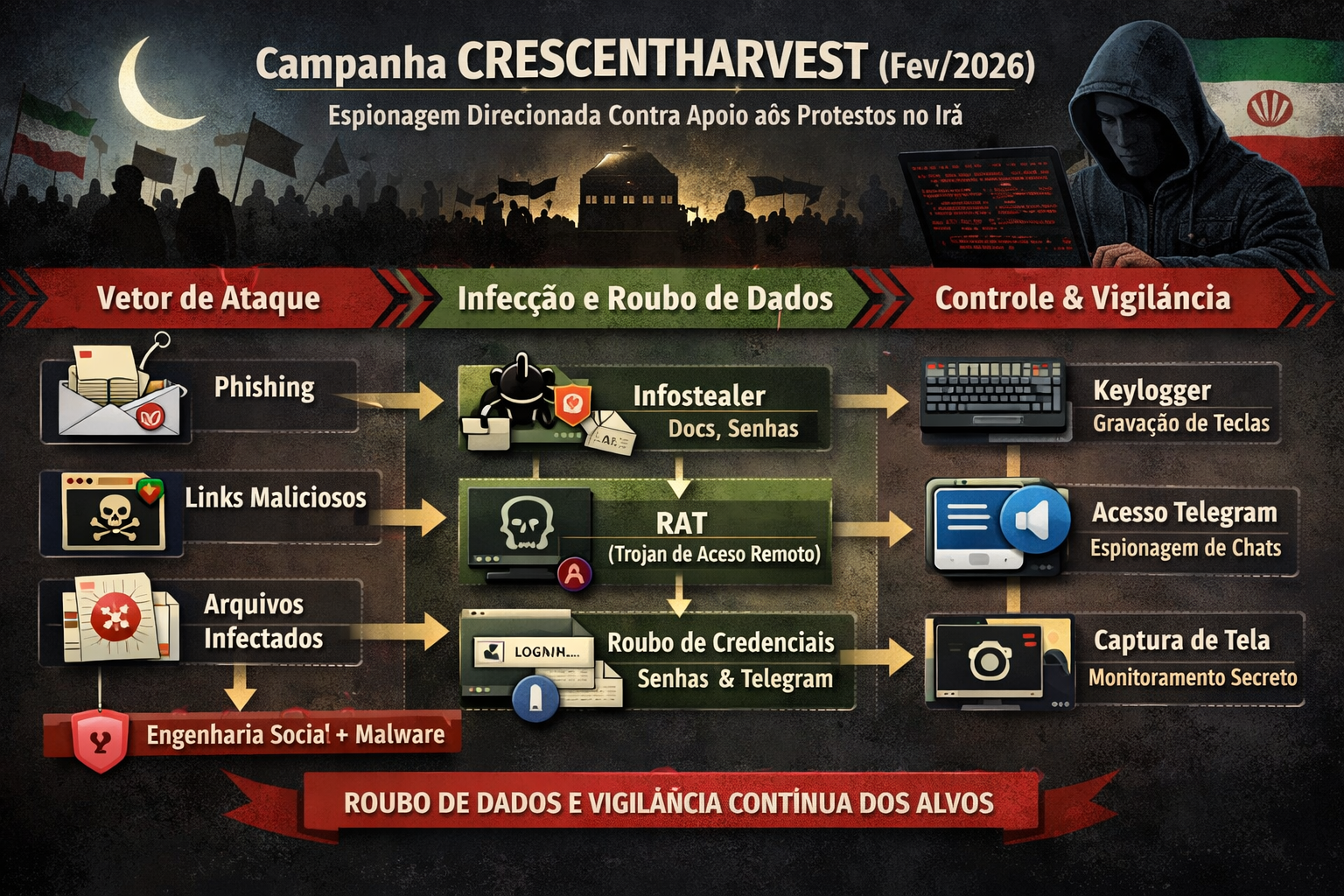A campanha CRESCENTHARVEST (fev/2026) é um exemplo clássico de espionagem direcionada (state-aligned) usando engenharia social + malware/infostealer para vigiar e roubar dados de pessoas ligadas/solidárias aos protestos no Irã. O que aconteceu (cadeia técnica do ataque) objetivo roubo de informações + acesso remoto persistente (RAT) + vigilância (keylogger, coleta de credenciais, Telegram etc.).